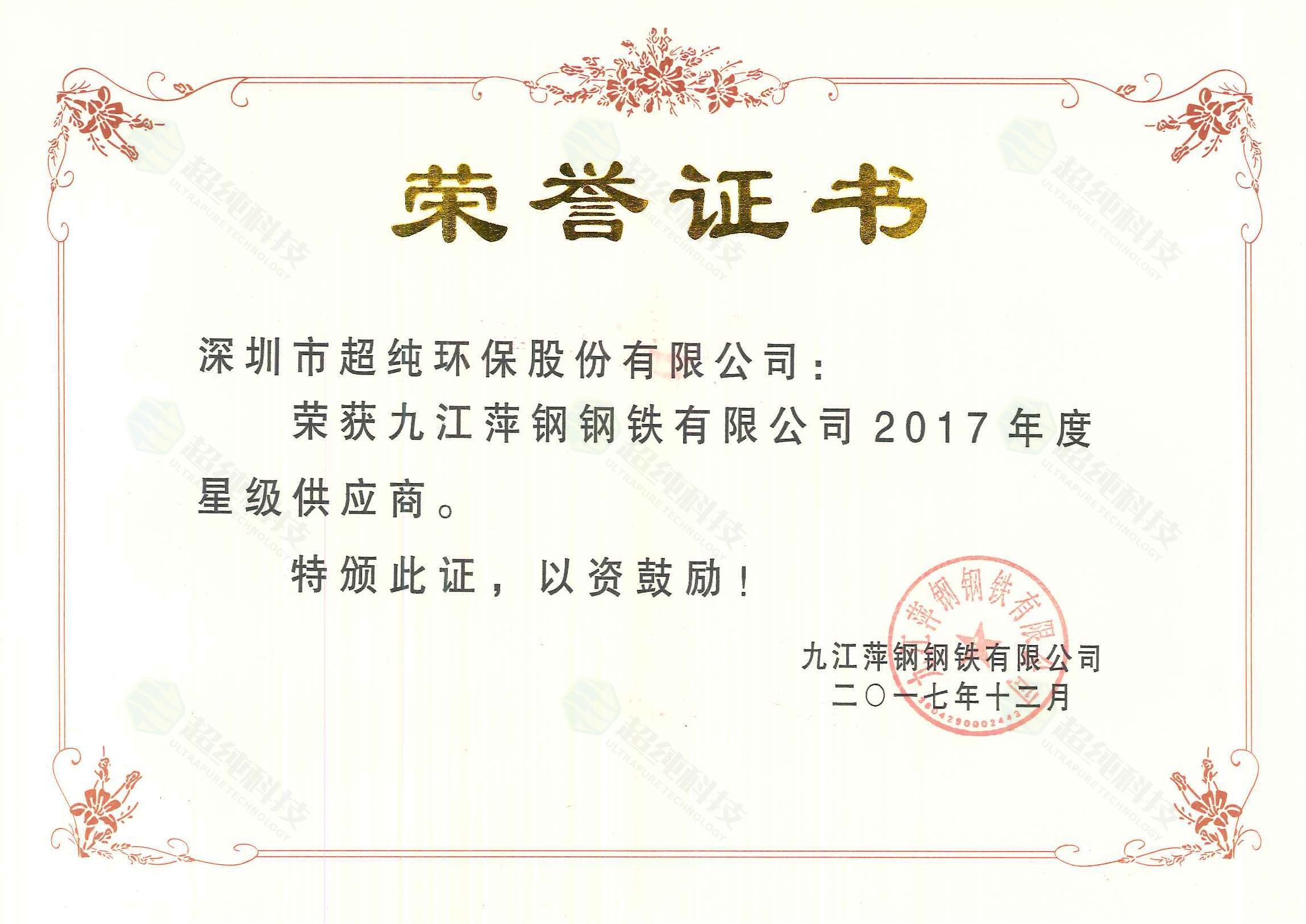 九江萍鋼鋼鐵榮譽(yù)證書