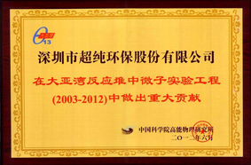 在2008年中國科學院高能物理研究所的反符合中微子探測器項目超純水系統公開招標中,公司憑借技術實力和服務優勢成功中標,經過三年多的技術攻關,所中標超純水系統項目取得圓滿成功,并被中國科學院高能物理研究所授予“重大貢獻獎”。
