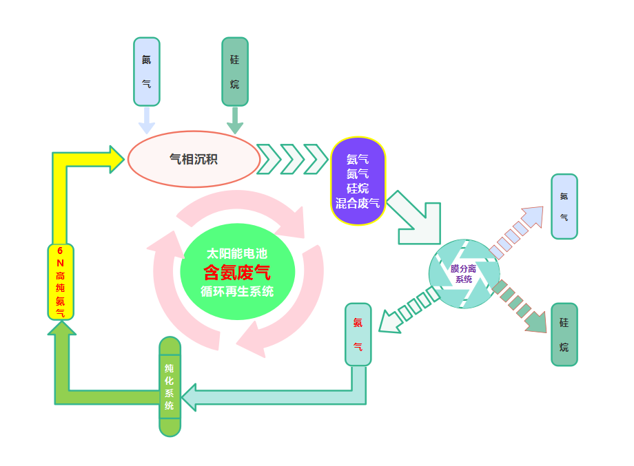 公司為光伏企業提供含氨廢氣回收電子級氨氣再生利用系統,將光伏電池生產線氮化硅鍍膜工藝段產生的含氨廢氣,經過膜吸收、膜分離、純化處理,最后,經過嚴格的質量檢測和調控,確保再生后的硅烷氨氣滿足工業生產所需的純度和品質要求,從而重新投入生產線,形成閉路循環。含氨廢氣實現氨的零排放,節省大量含氨廢氣處理成本。同時,提純后的氨氣達到6N級重新回用于光伏電池生產中,替代電子級液氨的采購成本,節省大量原料采購費用。